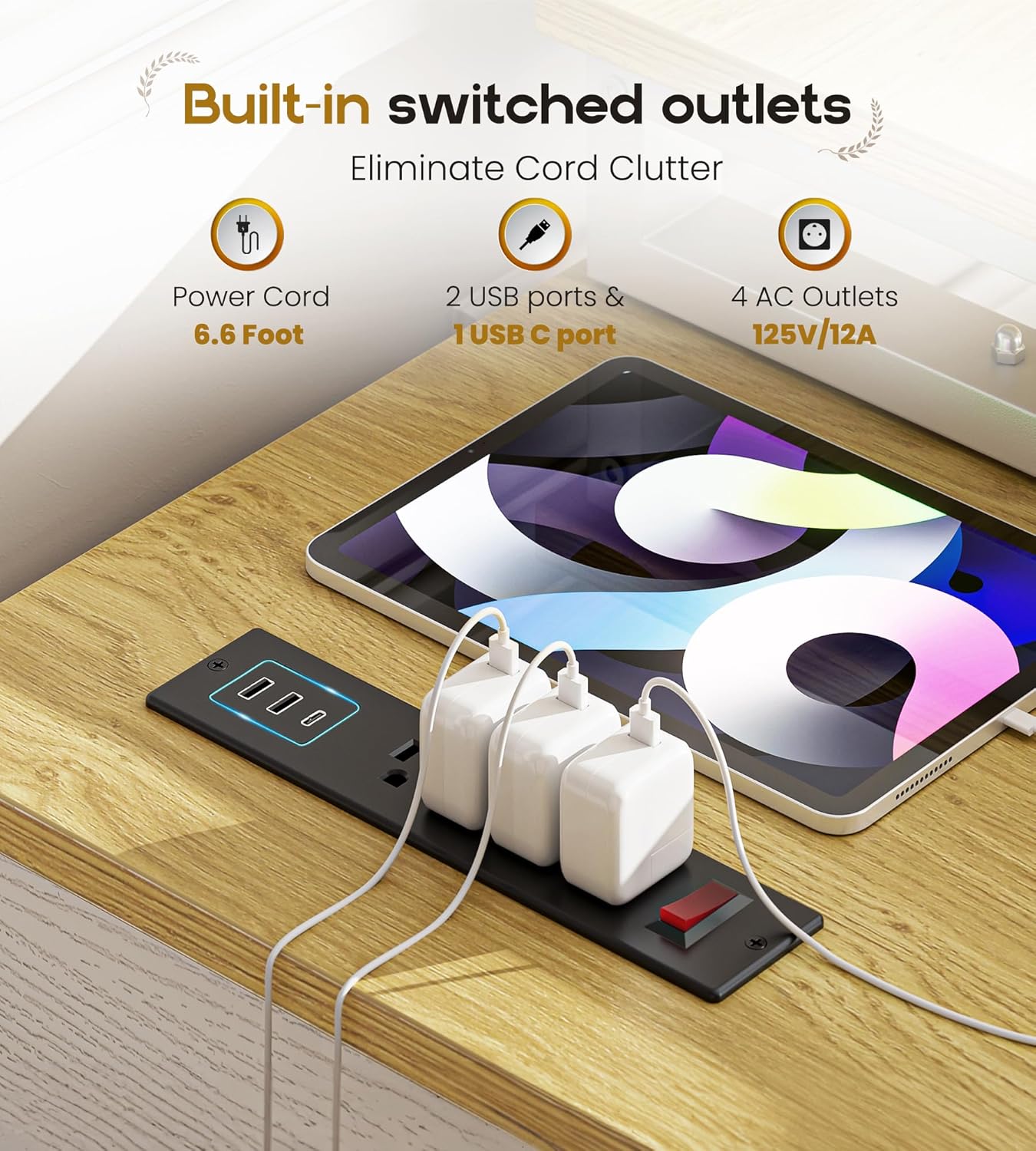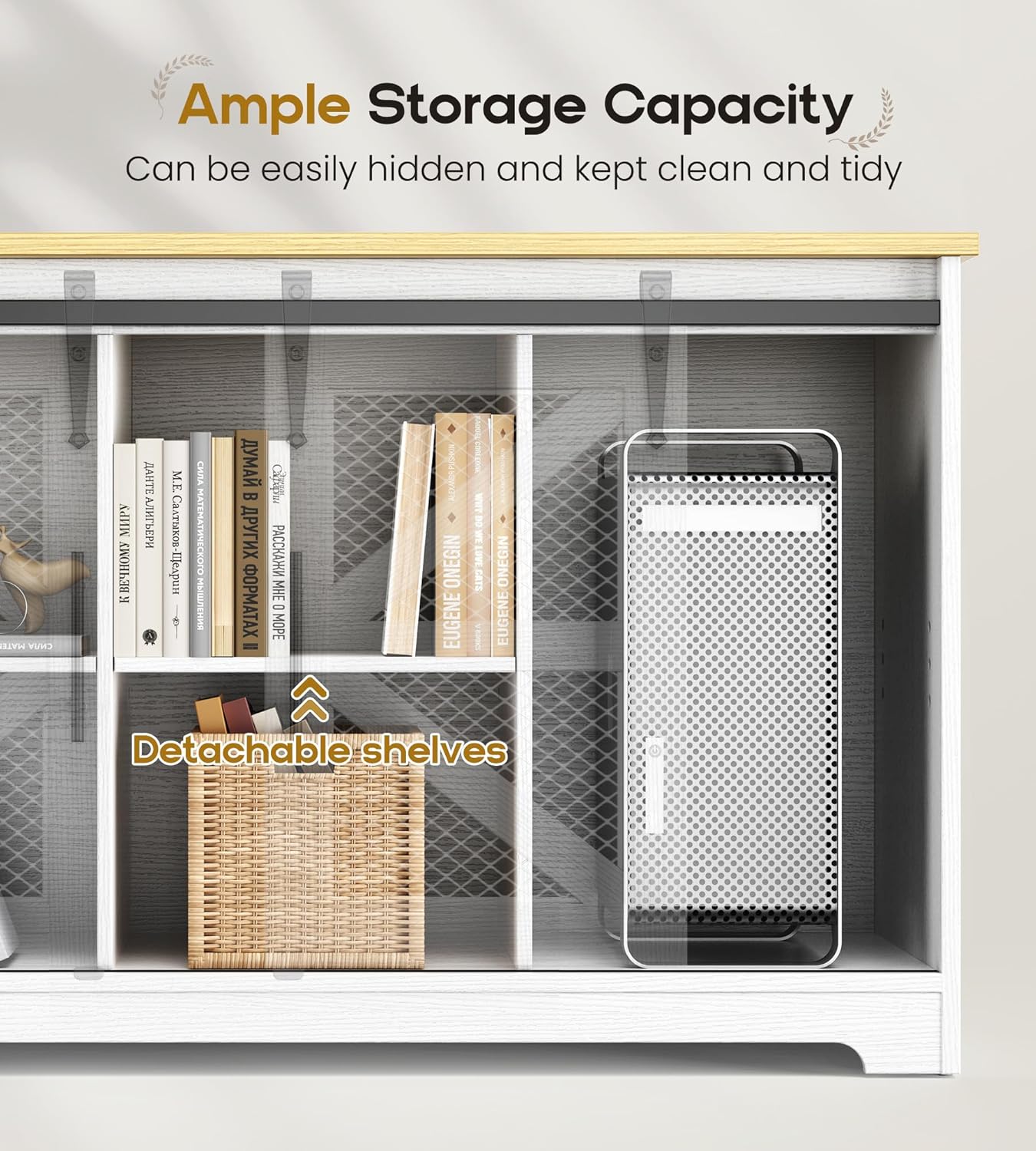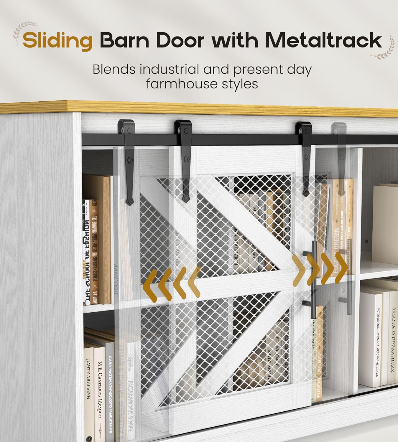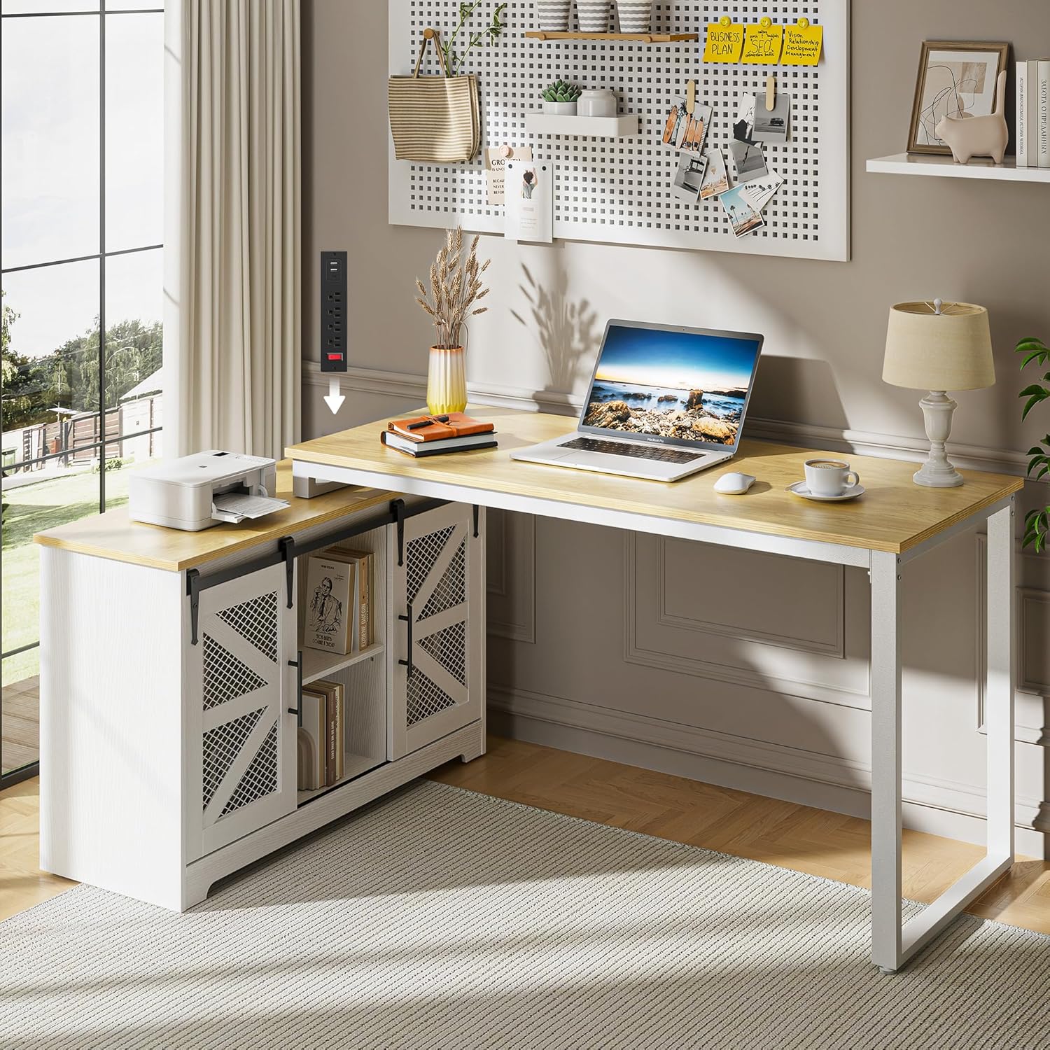 Rustic Corner Desk with Storage, L Shaped Farmhouse Office Desk with Sufficient Storage Capacity, Built-in Power Socket and Barn Door Design