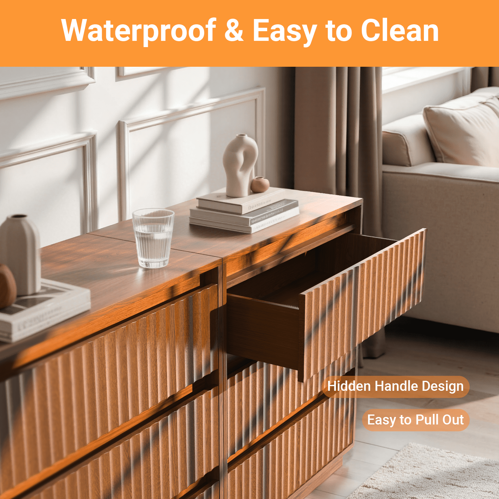 Add a touch of vintage and modern sense by taking our new 3-drawer single dresser (nightstand) into your bedroom or living space. Crafted with heavy-duty engineered wood with a smooth natural walnut brown finish, The standout design element is each drawer's unique waveform fluted panel, paired with a handle-hidden style that maximizes the modern and clean aesthetic, ensuring your space remains uncluttered and stylish. 3 smooth sliding drawers offer up versatile storage options. The top leaves room to add a mirror, or display a table lamp and framed photo. The bottom base is made of durable solid wood and features with anti-tip structure to keep all your family safe. At 27.5'' wide, this dresser(nightstand) is sized to fit into narrow spaces or for rooms short on square footage. This dresser is a perfect Blend of Style and Functionality.